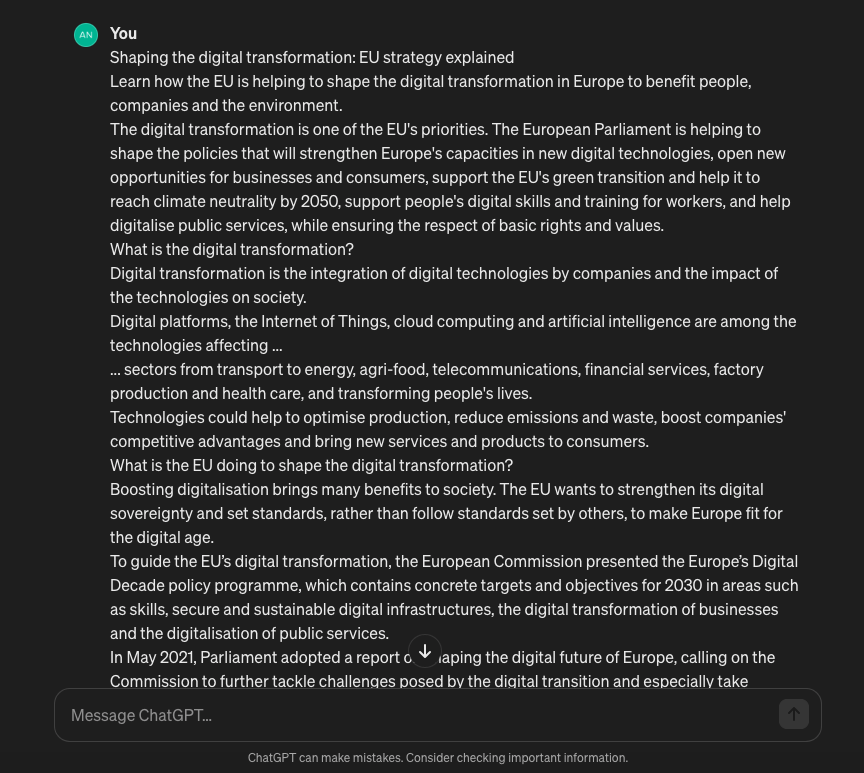Vediamo dunque un esempio di cosa possiamo fare. Per il nostro esempio, abbiamo preso come riferimento l’articolo “Shaping the digital transformation: EU strategy explained” pubblicato sul sito del Parlamento Europeo, che parla di “come l’UE sta contribuendo alla trasformazione digitale in Europa a vantaggio delle persone, delle aziende e dell’ambiente”.