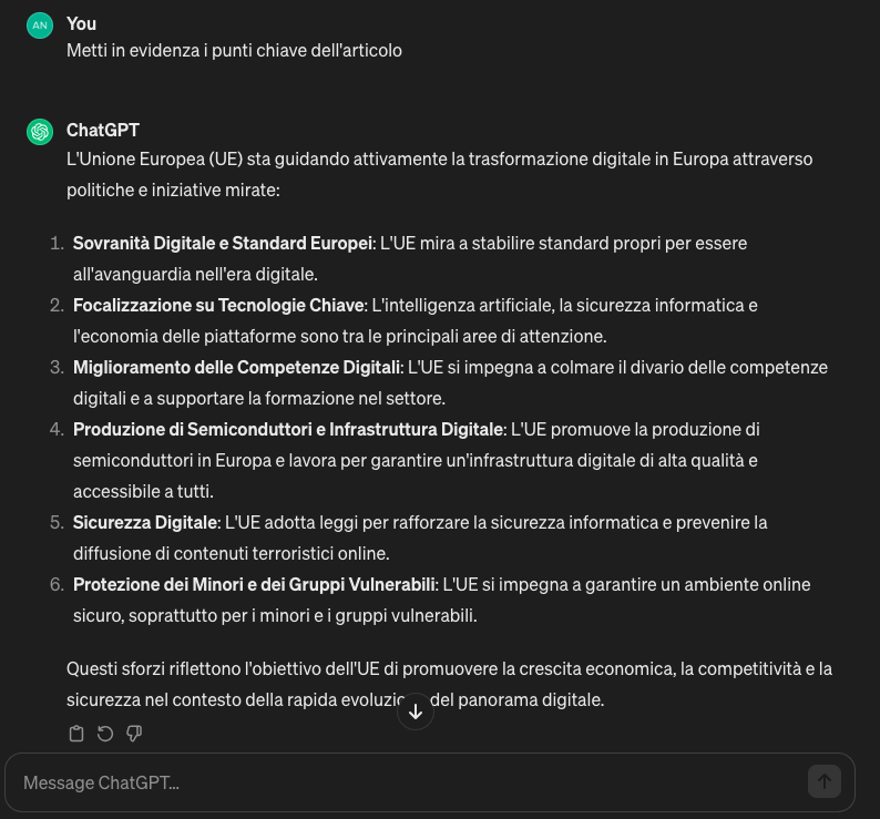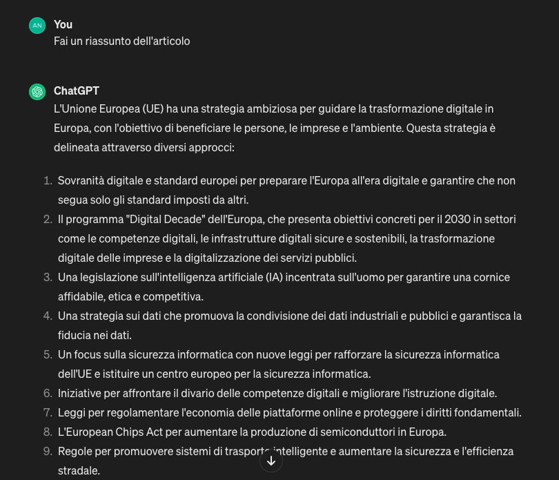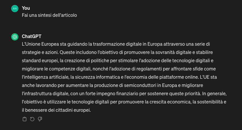 Ora che abbiamo sottoposto il contenuto a ChatGPT, possiamo digitare e inviare un prompt del tipo “Fai un riassunto dell’articolo” o “Fai una sintesi dell’articolo”.