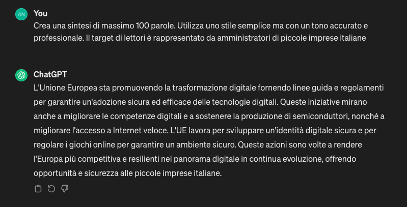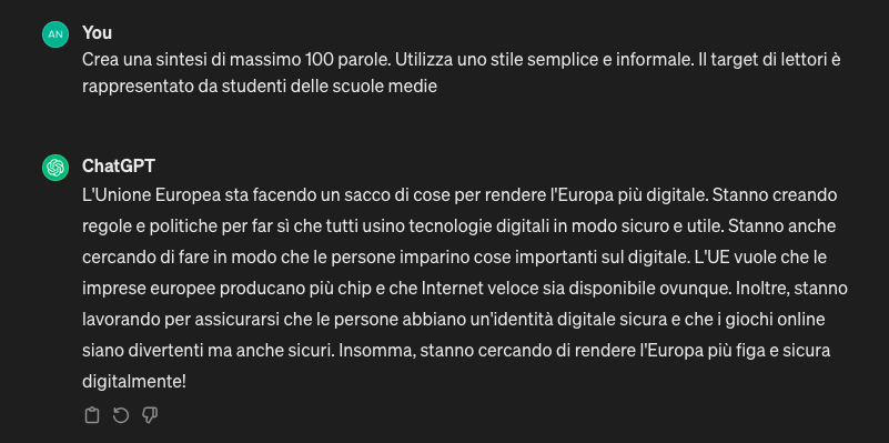 Abbiamo poi la possibilità di indicare uno stile. Ad esempio, a seconda del tipo di utilizzo e del target del lavoro che stiamo elaborando, potremmo impostare un prompt: “Crea una sintesi di massimo 100 parole. Utilizza uno stile semplice e informale. Il target di lettori è rappresentato da studenti delle scuole medie”; oppure: “Crea una sintesi di massimo 100 parole. Utilizza uno stile semplice ma con un tono accurato e professionale. Il target di lettori è rappresentato da amministratori di piccole imprese italiane”.