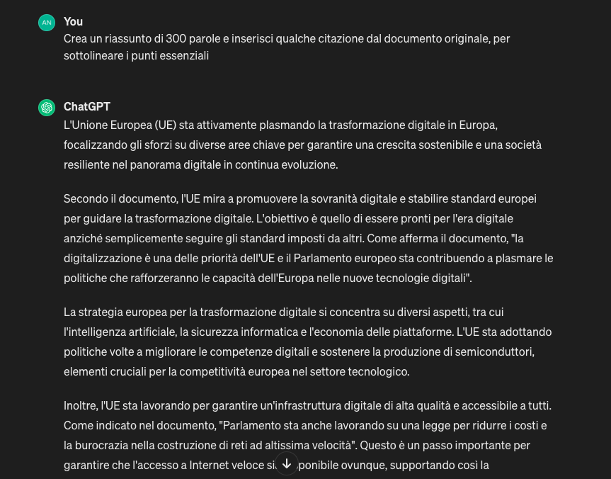 Ad esempio, potremmo chiedere a ChatGPT di inserire anche qualche citazione dal documento originale, per sottolineare i punti essenziali.