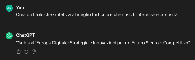 Per completare l’opera potremmo mettere inoltre alla prova le capacità “creative” di ChatGPT chiedendogli di suggerisci un titolo per il nostro report (o qualsiasi cosa sia, ciò a cui stiamo lavorando).