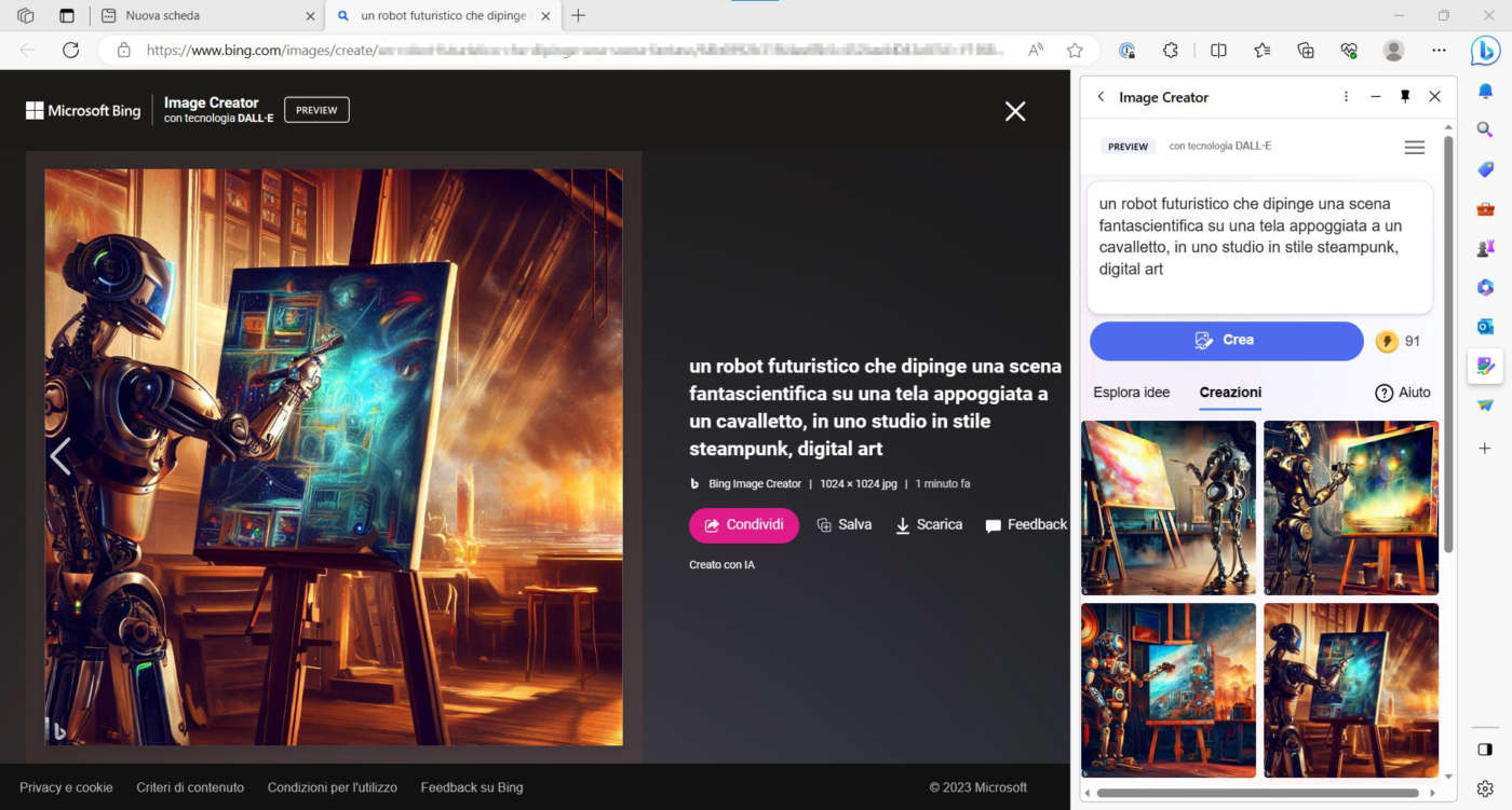 Alla fine dell’elaborazione, Image Creator mostrerà quattro anteprime delle sue creazioni. Se facciamo clic su una preview, Microsoft Edge apre un nuovo pannello con l’immagine selezionata ingrandita, nella finestra principale.