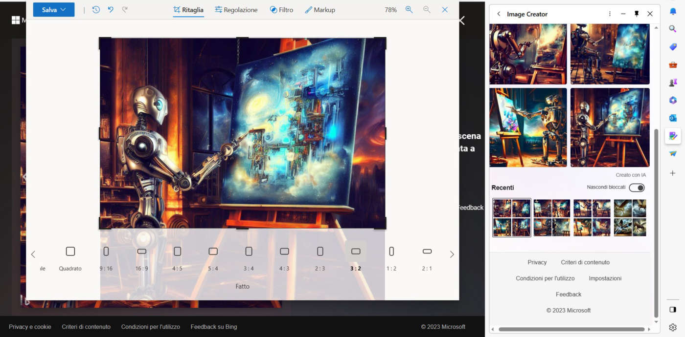 Si tratta in questo caso dell’editor d’immagini integrato in Microsoft Edge, che non si basa sulla tecnologia di intelligenza artificiale di Image Creator e che possiamo usare per qualsiasi immagine sul web: è comunque uno strumento prezioso se desideriamo apportare velocemente qualche modifica e non abbiamo l’esigenza di utilizzare software specialistici.