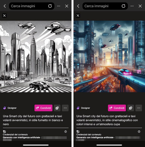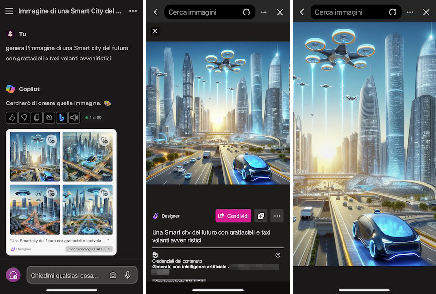 Nel campo di input del prompt, scriviamo qualcosa come “crea” o “genera” o “fai” e poi descriviamo in linguaggio naturale l’immagine che desideriamo ottenere (ad esempio: “l’immagine di una smart city del futuro con grattacieli e taxi volanti avveniristici”).