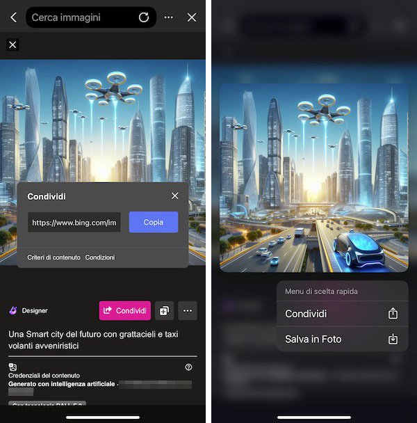 Un tocco sul pulsante Condividi, nella vista dell’anteprima singola, fa sì che Copilot generi un link che punta a un server Microsoft Bing. Possiamo copiare il link e condividerlo con altre persone che potranno visualizzare l’immagine generata dall’AI.