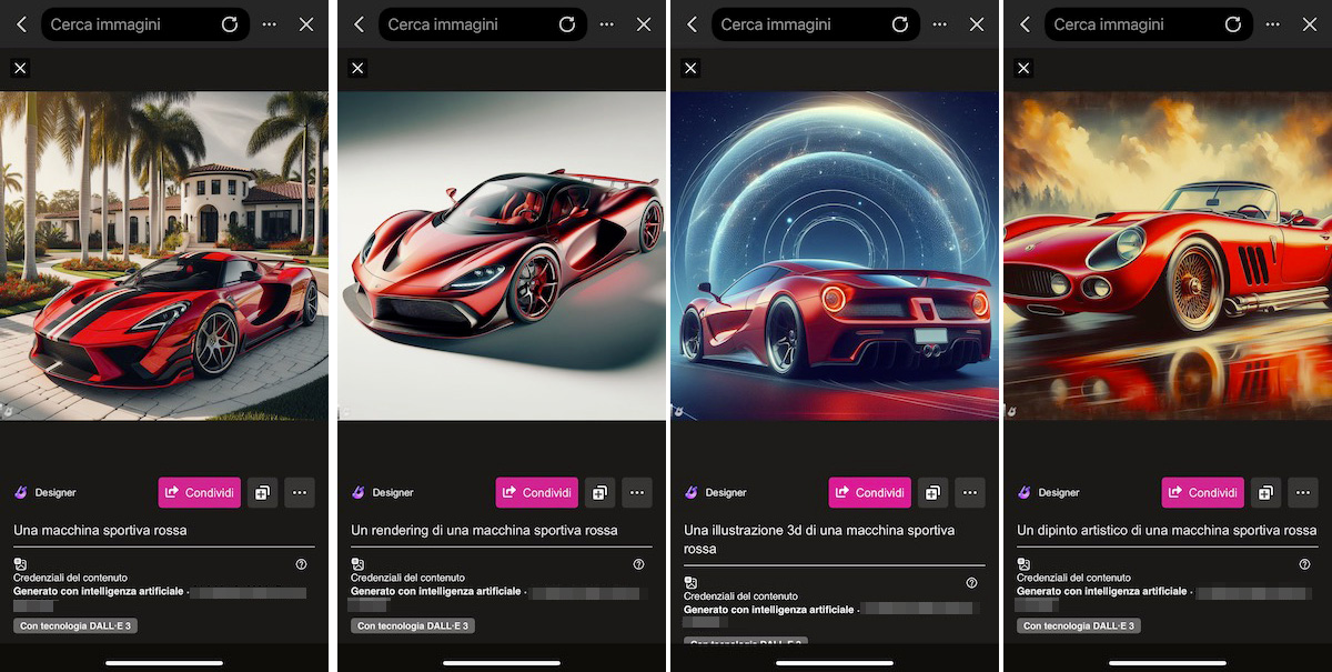 Anche il tipo di immagine che chiediamo di generare ha il suo impatto sul risultato finale, che sarà diverso se, ad esempio, di una “macchina sportiva rossa” chiediamo di generare una foto, un rendering, una illustrazione 3D o un dipinto artistico.