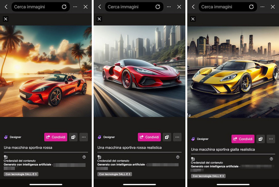 Inoltre, sfruttando il contesto della chat, abbiamo anche la possibilità di avvicinarci maggiormente al risultato che abbiamo in mente mediante affinamenti successivi. Ad esempio, se chiediamo di creare “l’immagine di una macchina sportiva rossa” ma l’output che riceviamo è a nostro avviso troppo poco fotorealistico, basterà inviare la richiesta “falla più realistica”. E, se cambiamo idea, chiedere: “falla gialla”.