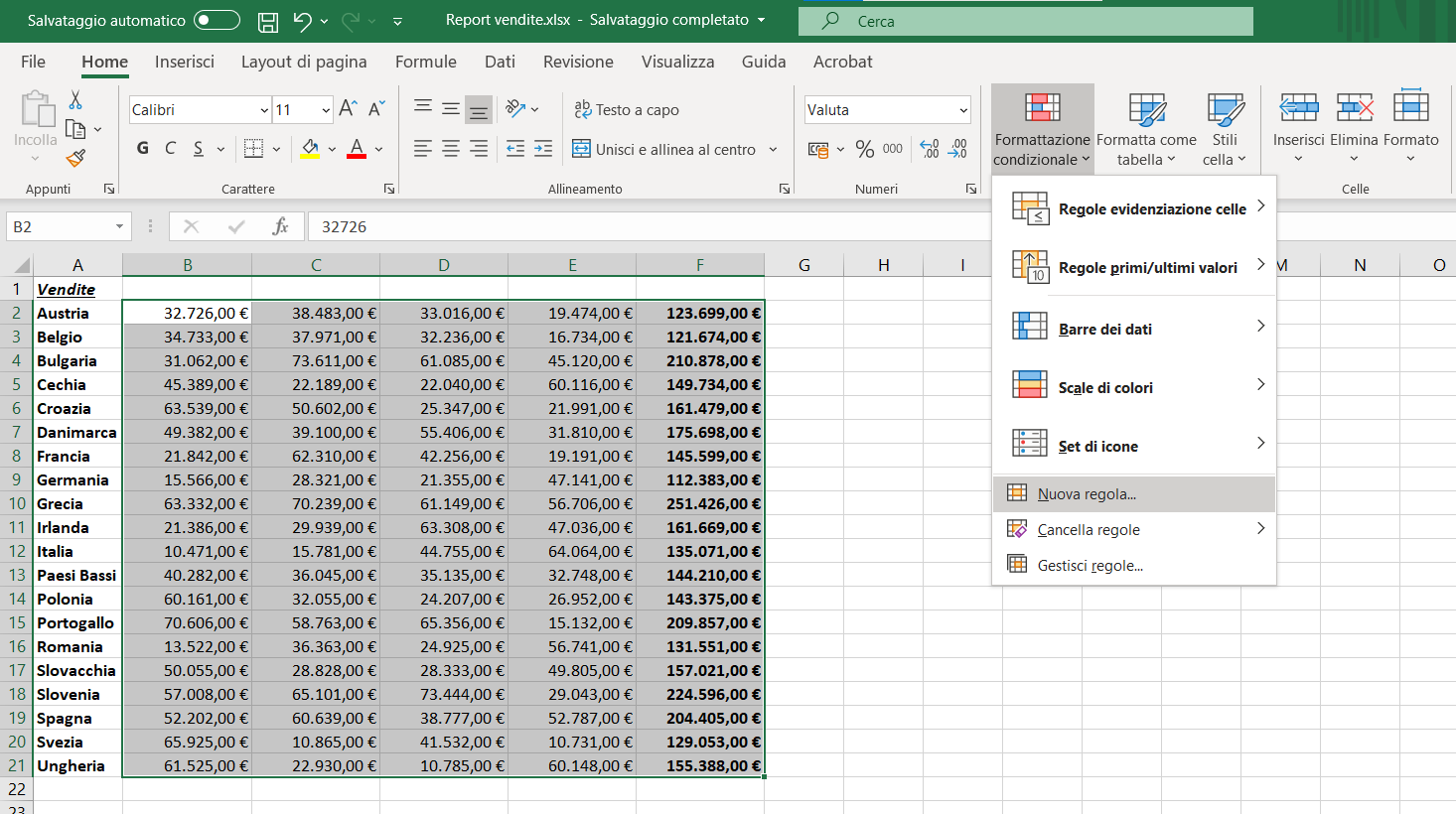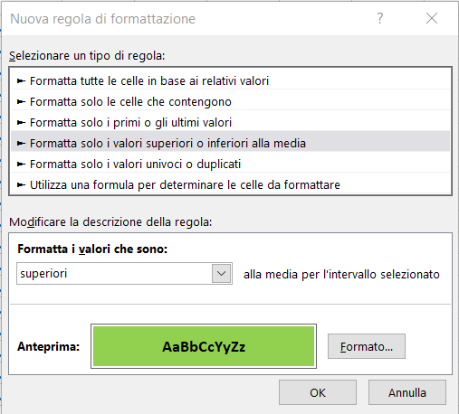 Nel nostro esempio, in un report di vendite vogliamo evidenziare i valori superiori alla media. Nella finestra di dialogo impostiamo la regola in modo che siano formattati solo i valori superiori alla media dell’intervallo selezionato e (facendo clic sul pulsante Formato, che apre la familiare finestra Formato celle) personalizziamo lo stile che devono assumere le celle in cui la regola è vera (nel nostro caso testo in grassetto e riempimento di colore verde).