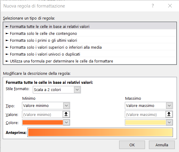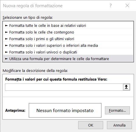 Excel mostra la finestra di dialogo Nuova regola di formattazione in cui possiamo impostare i parametri della nostra nuova regola.