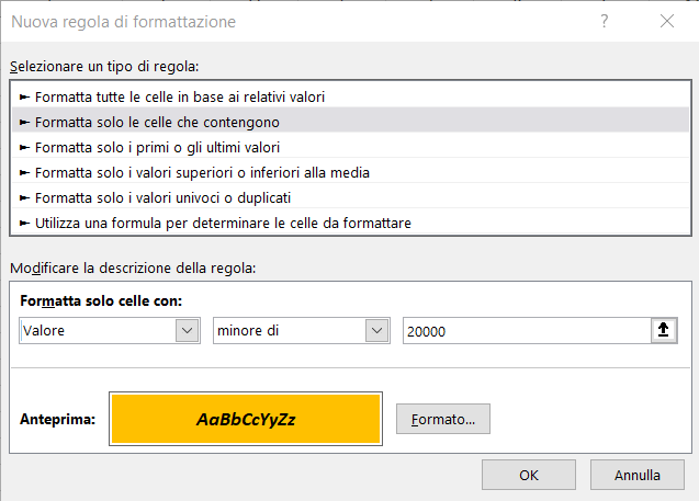 Nel campo in alto seleziona il tipo di regola che determina la formattazione dei valori. Ciascuna regola avrà dei propri parametri da impostare.