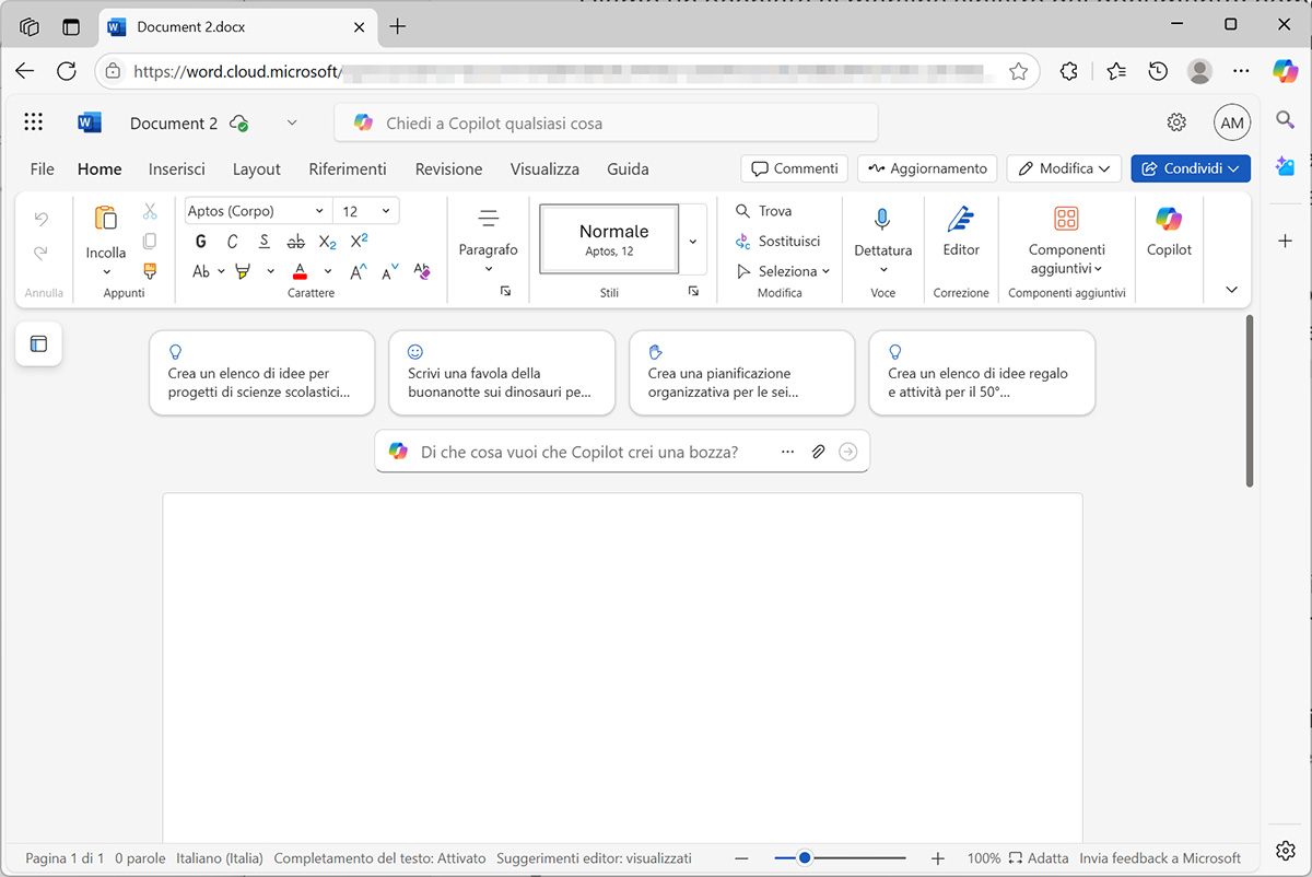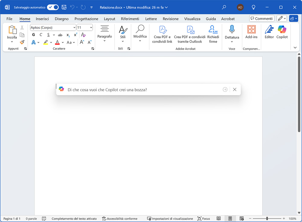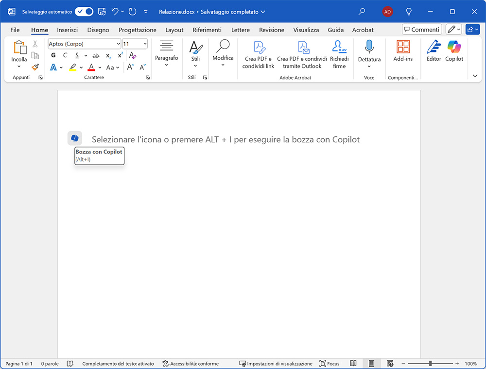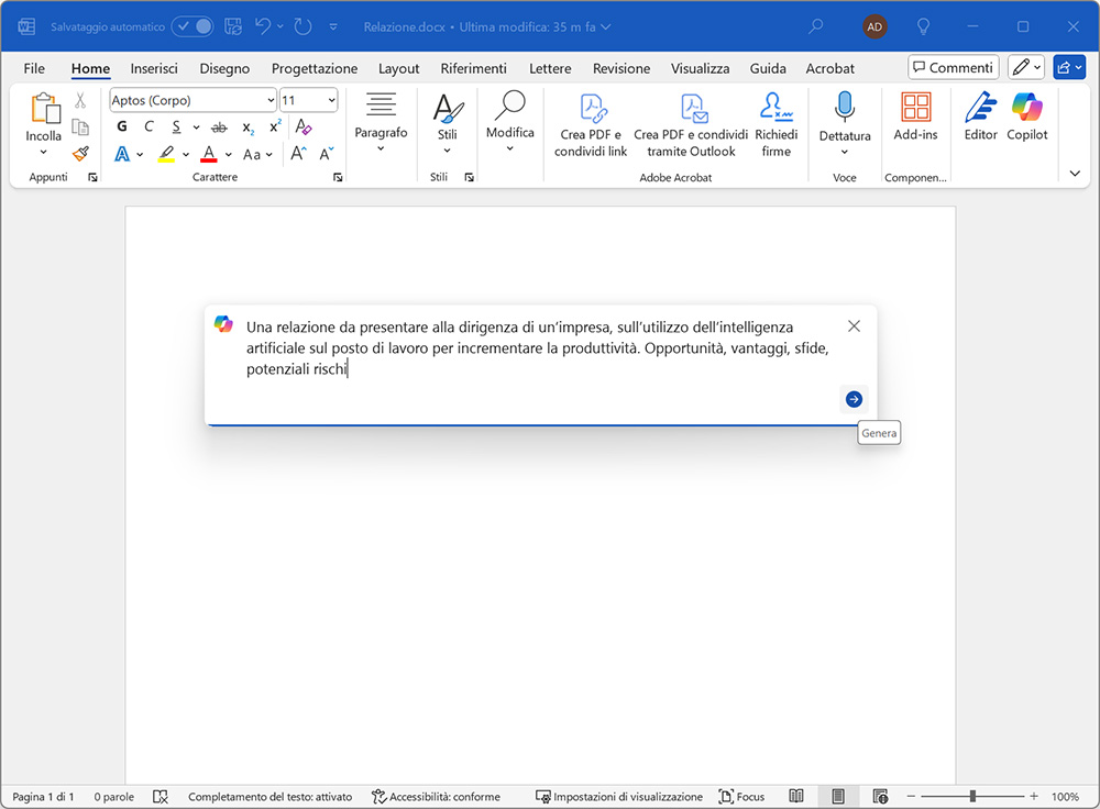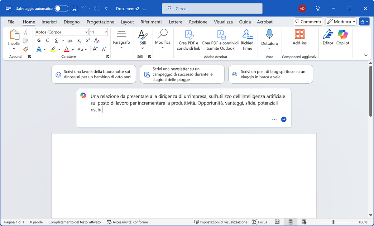 Copilot ci segue fin dai primi passi: vediamo quindi un esempio partendo dall’inizio, da zero, dalla pagina bianca. Nel nostro esempio, stiamo preparando una relazione da presentare alla dirigenza di un’impresa, sull’utilizzo dell’intelligenza artificiale sul posto di lavoro per incrementare la produttività.