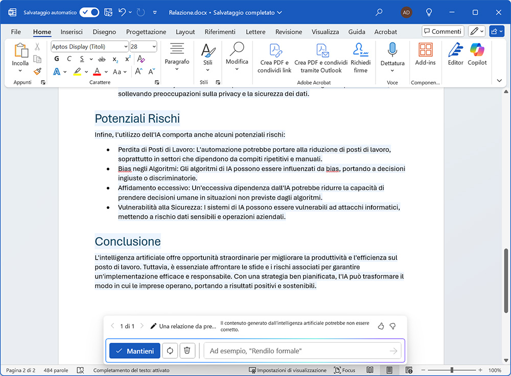 Dopo un tempo più o meno lungo di elaborazione a seconda del tipo di attività, in cui Word ci fornisce un feedback sull’avanzamento delle operazioni, Copilot inizia a inserire nel documento il contenuto generato dall’intelligenza artificiale.