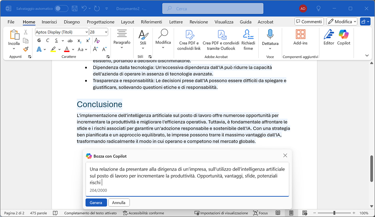 Nel nostro caso, usiamo un prompt molto semplice, per mantenere la trattazione focalizzata sugli strumenti di Copilot in Word, che è l’oggetto principale del nostro articolo. Nei casi d’uso reale il prompt chiaramente riveste un’importanza cruciale ed è il passaggio che merita la maggiore cura.