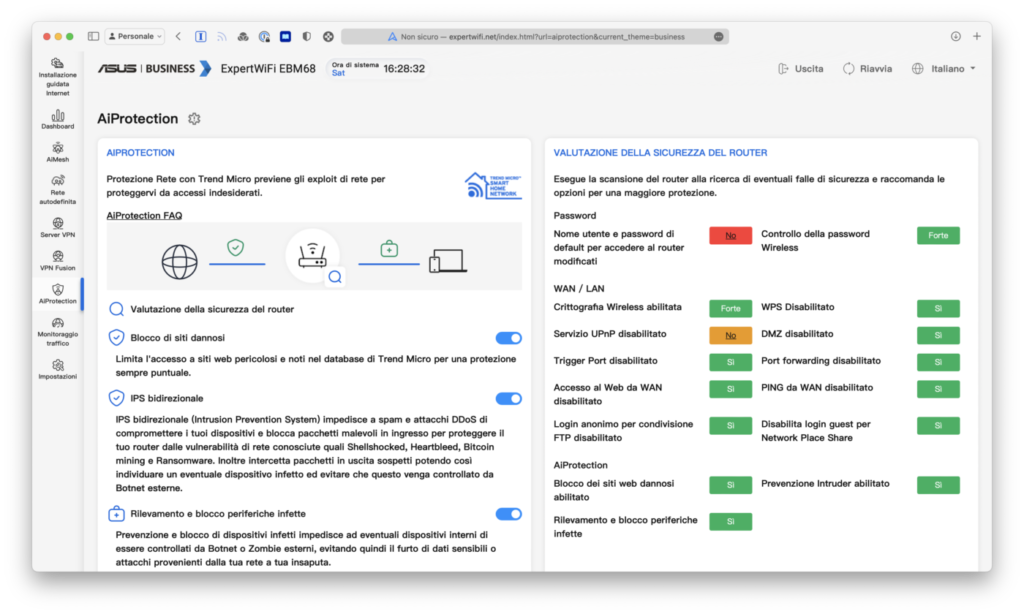 Inoltre, sempre incluso nei servizi online gratuiti, c’è il pacchetto AiProtection Pro realizzato in collaborazione con Trend Micro. La funzionalità principale consiste nel prevenire ogni possibile exploit di rete proteggendo così la rete da accessi non desiderati e malevoli, analizzando il traffico in entrata e uscita e riconoscendo così i tentativi di attacco. Propone di filtrare i siti considerati pericolosi dall’azienda di antivirus, con una lista continuamente aggiornata man mano che vengono scoperte nuove minacce, ed è in grado di identificare periferiche infette capaci di veicolare attacchi dall’interno o essere agganciate a Botnet: con l’aumento delle periferiche IoT, non sempre adeguatamente protette dai loro produttori, è possibile infatti che i malintenzionati sfruttino vulnerabilità note per infettarne i firmware, prendendone il controllo poi remotamente.