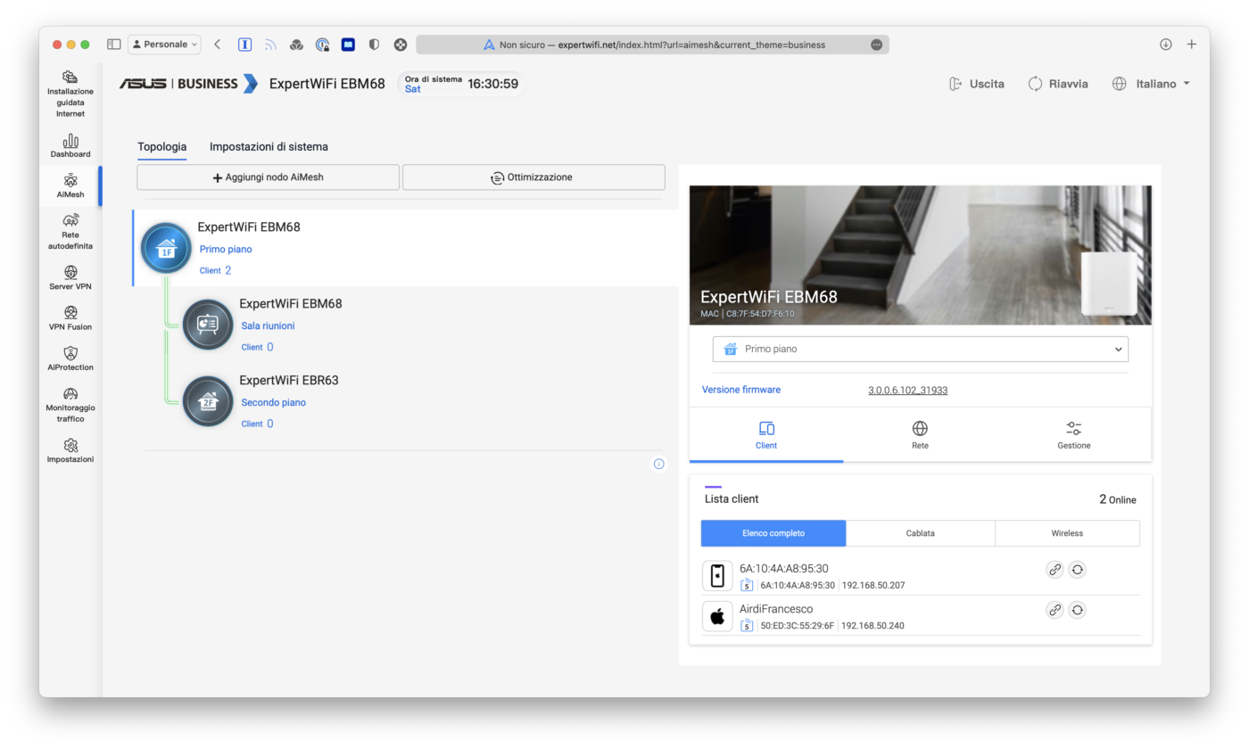 L’installazione, la configurazione e il controllo delle reti ExpertWiFi può effettuarsi con l’app omonima per smartphone, oppure collegandosi all’indirizzo IP assegnato al prodotto di ASUS, tipicamente quello che termina con .1. Il tutto è centralizzato e accessibile anche da remoto, ed è ricco di dashboard per monitorare lo stato della rete, il livello di protezione e ogni altra informazione utile a fornire ai propri utenti, siano essi dipendenti, clienti o ospiti, la miglior navigazione possibile.