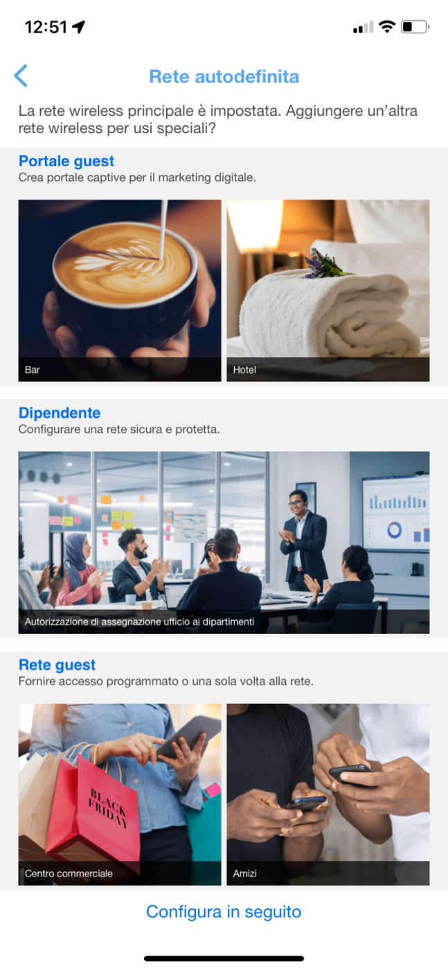 I prodotti ExpertWiFi permettono di configurare fino a 5 diverse reti SDN (Self-Defined Network), impostate per i più diversi utilizzi. L’app ha una procedura guidata per la configurazione degli scenari tipici, pensati per semplificare la gestione della rete.