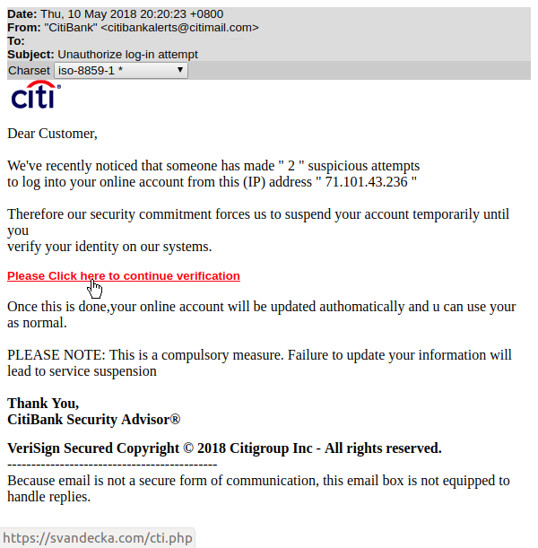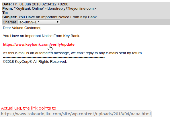 Un secondo esempio mostra un attacco in cui il criminale cerca di raccogliere informazioni dall’utente. I criminali tentano sempre di ottenere informazioni dagli utenti e, in questo caso, l’esca è un finto messaggio della banca che invita l’utente a fare una qualche operazione sul suo conto. I criminali qui hanno fatto un discreto lavoro, in quanto il messaggio potrebbe sembrare come inviato davvero dalla banca. Se l’utente clicca sul link sarà invitato a inserire le proprie credenziali in una nuova finestra, consegnando al criminale il suo nome utente e password.