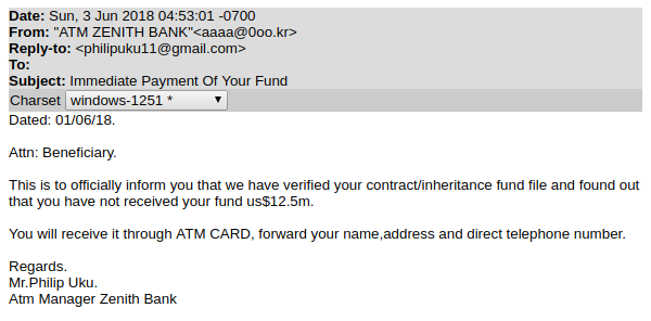 Mail di questo genere sono abbastanza comuni e spesso, come in questo caso, promettono forti somme di denaro. Quando l’utente risponde il criminale in genere richiede una certa somma di denaro promettendo a sua volta una somma assai più consistente. Inutile dire che la promessa non sarà mantenuta.