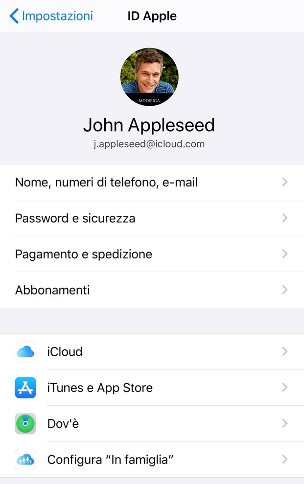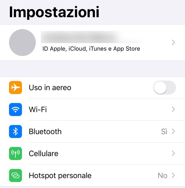 Apri l’app Impostazioni e tocca il tuo nome, sotto il quale sono indicati i servizi e le funzioni a cui si accede nella schermata di destinazione: ID Apple, iCloud, iTunes e App Store.