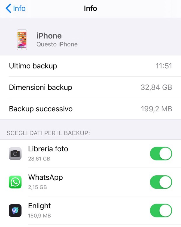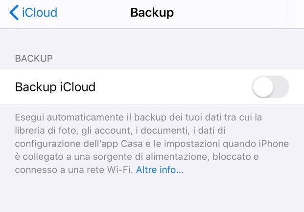 Tocca l’interruttore dell’opzione Backup iCloud per attivare questa funzione.