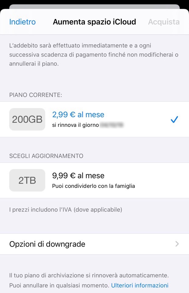 Se, da un lato, il backup su iCloud presenta molti vantaggi (tra tutti, il non dover collegare fisicamente iPhone al computer e poterlo eseguire ovunque siamo e in qualsiasi momento, facendo sempre salvi i requisiti che abbiamo visto), dall’altro porta quasi necessariamente a dover effettuare un upgrade del proprio spazio iCloud.
