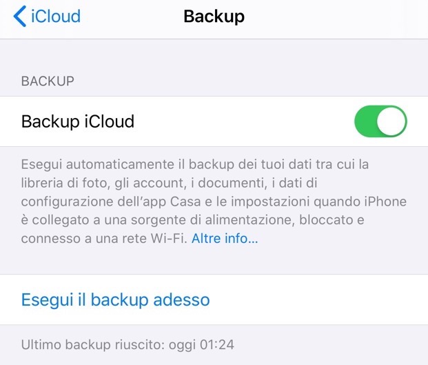Quando l’opzione Backup iCloud qui descritta è attiva, iOS esegue ogni giorno, in modo automatico, il backup di iPhone su iCloud.