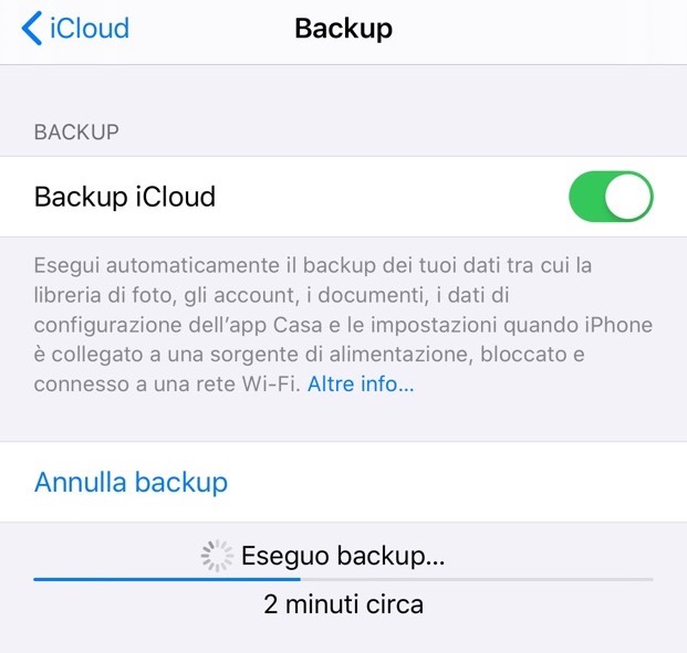 In questa stessa schermata iPhone mostra lo stato di avanzamento del backup e presenta una stima del tempo rimanente per il suo completamento.
