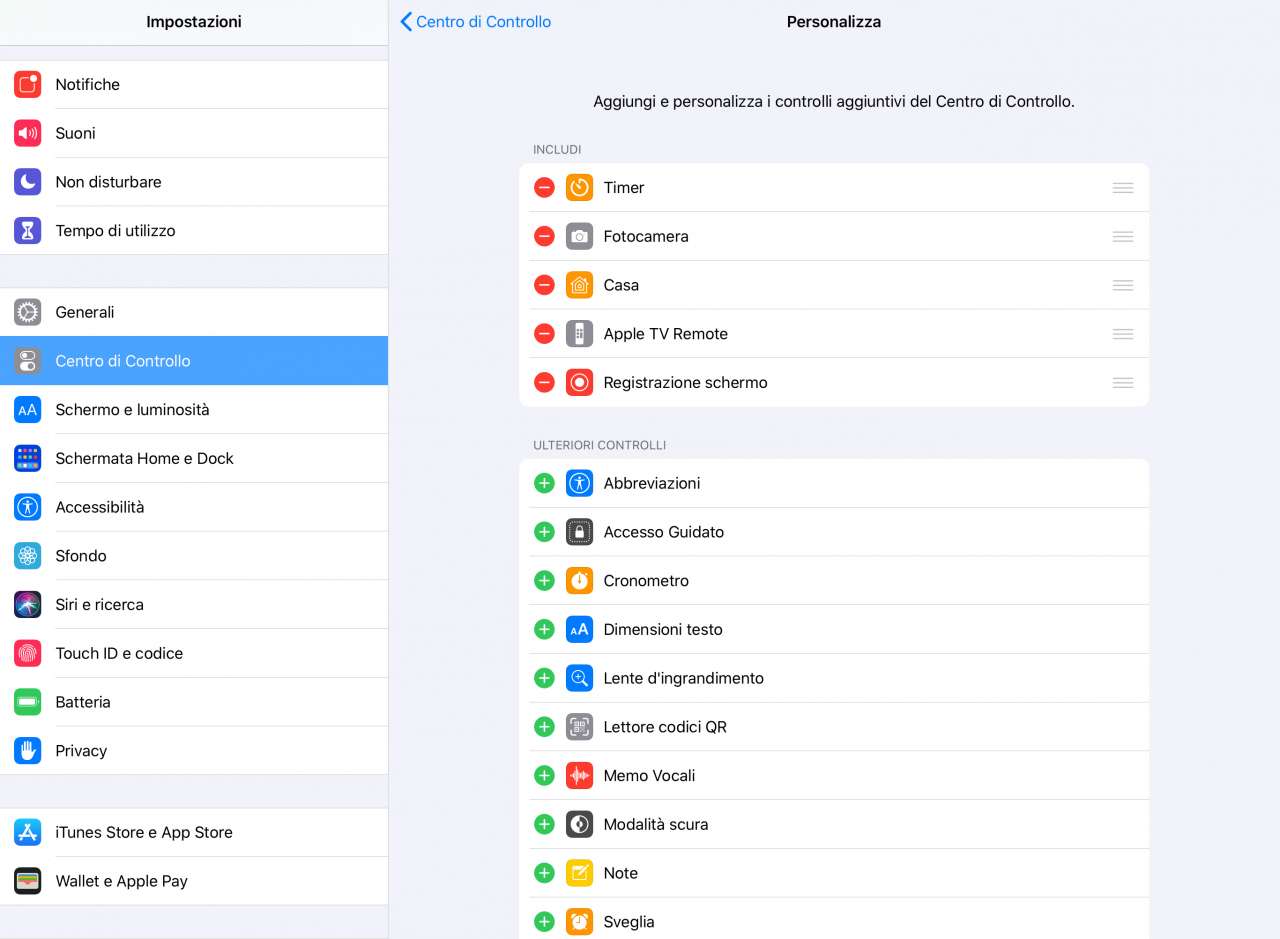 Per fare questo, apri l’app Impostazioni di iOS o iPadOS, poi tocca su Centro di Controllo e quindi tocca su Personalizza controlli. Nella scheda Personalizza delle Impostazioni del Centro di Controllo, in cima puoi vedere quelli già inclusi e, sotto, gli Ulteriori controlli che puoi scegliere di aggiungere.