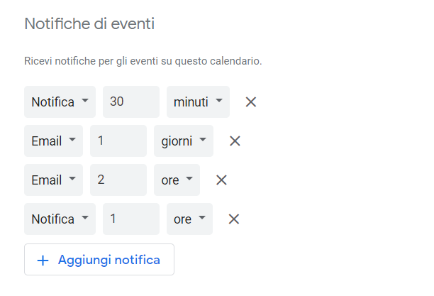Innanzitutto scegliendo tra Notifica e Email per una notifica, poi impostando il tempo e, se lo ritieni necessario, aggiungendo altre notifiche.