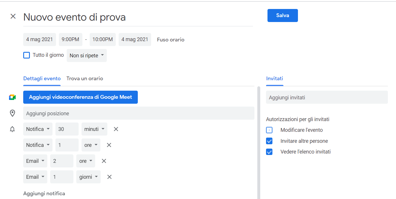 Ora, quando crei un nuovo evento vedrai che la sezione delle notifiche è già preimpostata nel modo in cui hai personalizzato le impostazioni predefinite. Chiaramente, in un singolo evento puoi anche ulteriormente modificare, aggiungere ed eliminare le notifiche nel modo che preferisci.