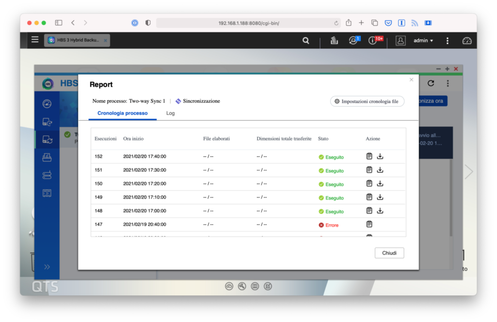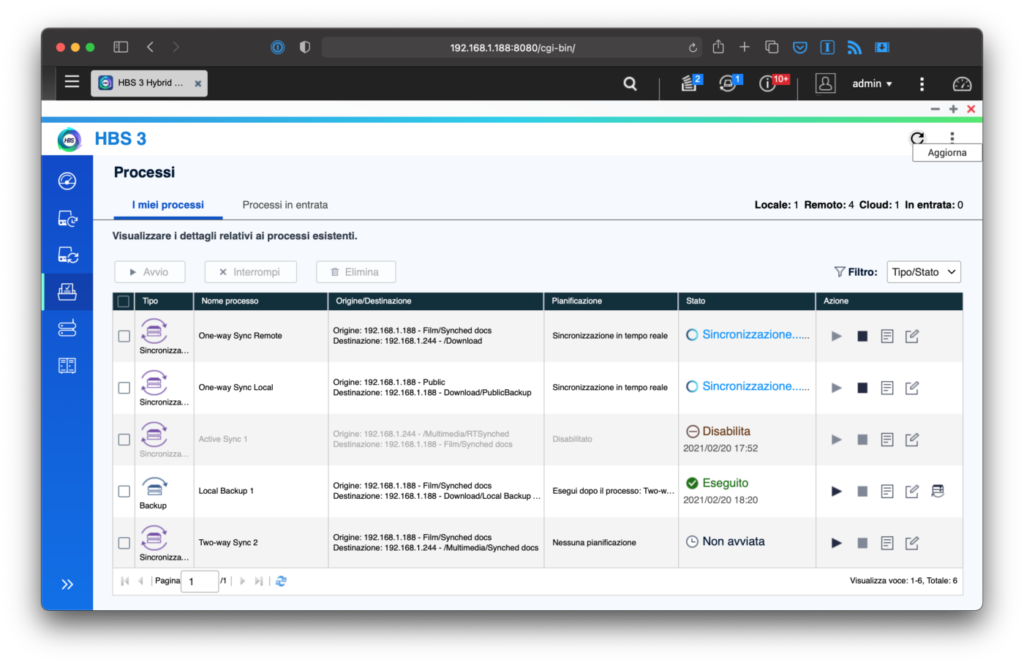 Sincronizzare due NAS è un’ottima soluzione per avere a disposizione tutti i dati pronti all’uso su un secondo dispositivo. HBS implementa il protocollo proprietario RTRR (Real-Time Remote Replication) grazie al quale attivare processi in grado di monitorare cartelle locali in cerca di file nuovi, rimossi o modificati, e applicare immediatamente la stessa modifica anche alla cartella di destinazione. Questa può essere locale, come ad esempio su un’unità disco esterna collegata via USB o SATA, o un NAS secondario.
