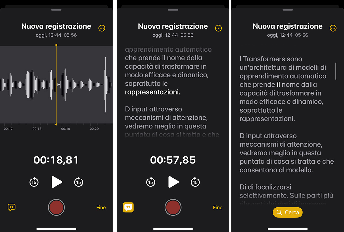 Se scorriamo il campo della trascrizione, l’app Note nasconde i controlli di riproduzione e concede più spazio di visualizzazione al testo. Non solo: viene mostrato anche il pulsante Cerca.