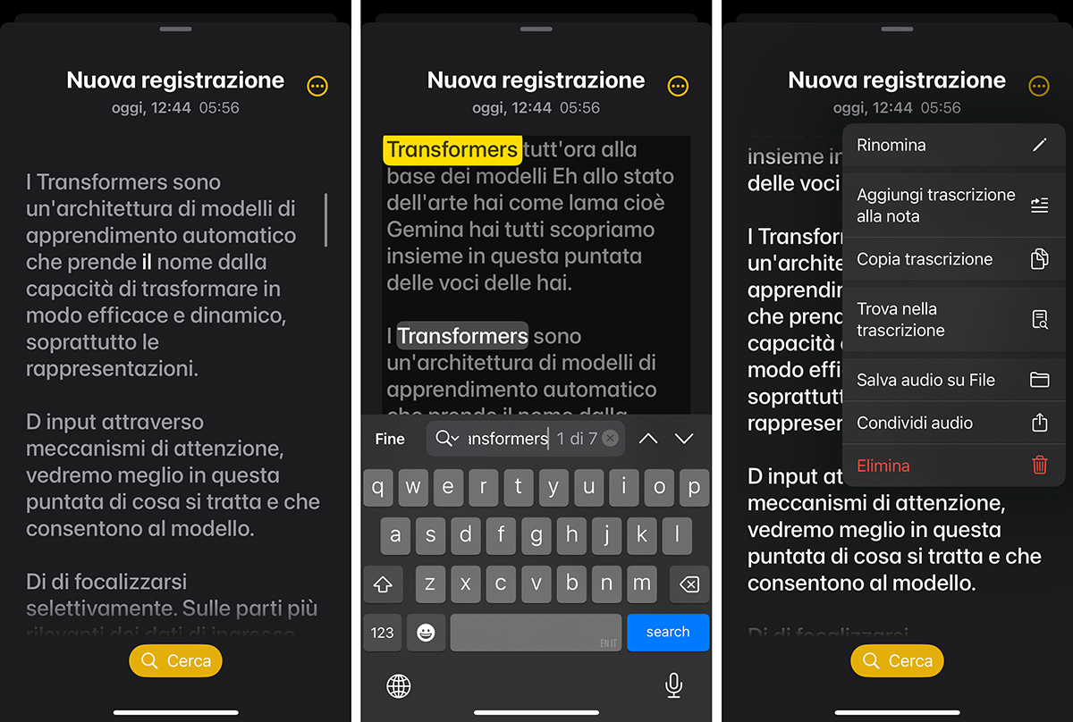 La stessa opzione è accessibile anche toccando il pulsante Altro (quello con l’icona con i tre puntini all’interno del cerchio) e poi – nel menu a comparsa – facendo tap su Trova nella trascrizione.