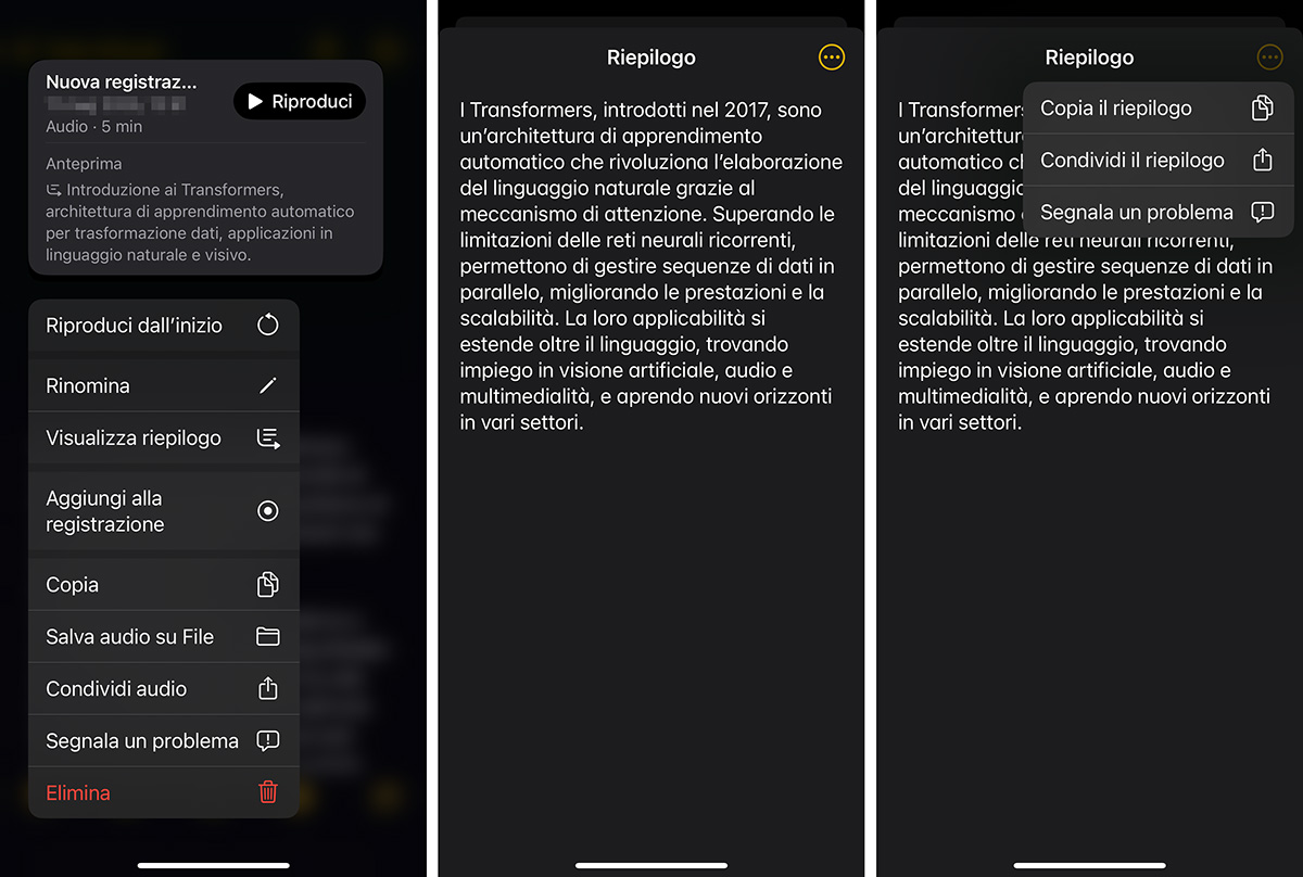 Tra di esse, c’è anche Visualizza riepilogo: questa opzione genera automaticamente e poi visualizza un riepilogo della trascrizione e può risultare utile specialmente in caso di registrazioni molto lunghe.