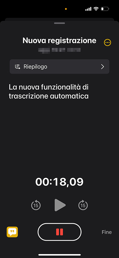 Abbiamo la possibilità di visualizzare la trascrizione, man mano che viene generata, anche durante la registrazione audio. Per fare questo, mentre stiamo registrando, basta toccare il pulsante Trascrizione in basso a sinistra.