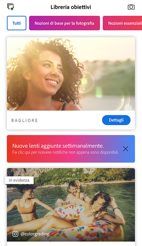 Nello sfogliare la libreria, puoi filtrare i contenuti per categoria e, per ogni lente, puoi fare tap su Dettagli per visualizzare una descrizione e alcuni esempi.
