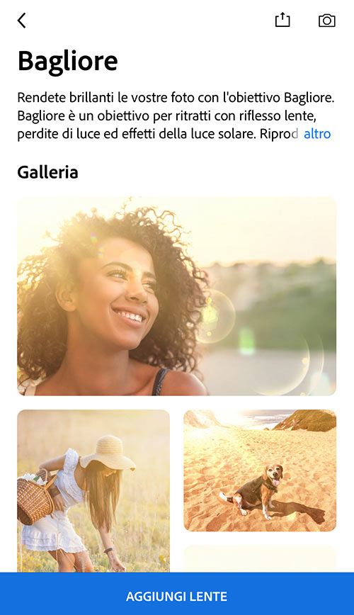 Quando trovi un obiettivo che ti piace, nella sua scheda basta un tocco sul pulsante Aggiungi lente per scaricarlo e renderlo disponibile nella tua lista di lenti.