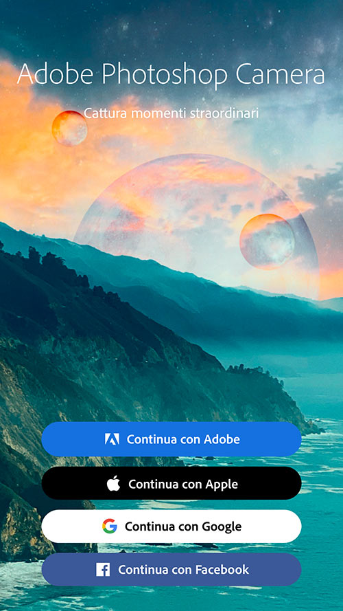 Per prima cosa, occorre accedere all’app con il proprio Adobe ID, oppure con l’account Apple, Google o Facebook.