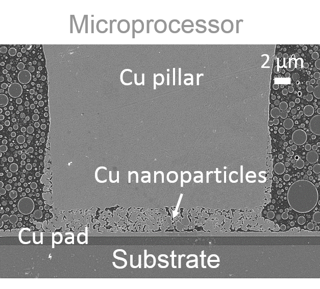 L’utilizzo di rame in nanoparticelle, ci permette di formare un contatto elettrico tramite sinterizzazione alla temperatura di soli 200 °C, sebbene il punto di fusione del rame sia a ben 1084 °C. Questo è possible grazie alla starordinaria diffusivitá del materiale a dimensioni nanoscopiche.