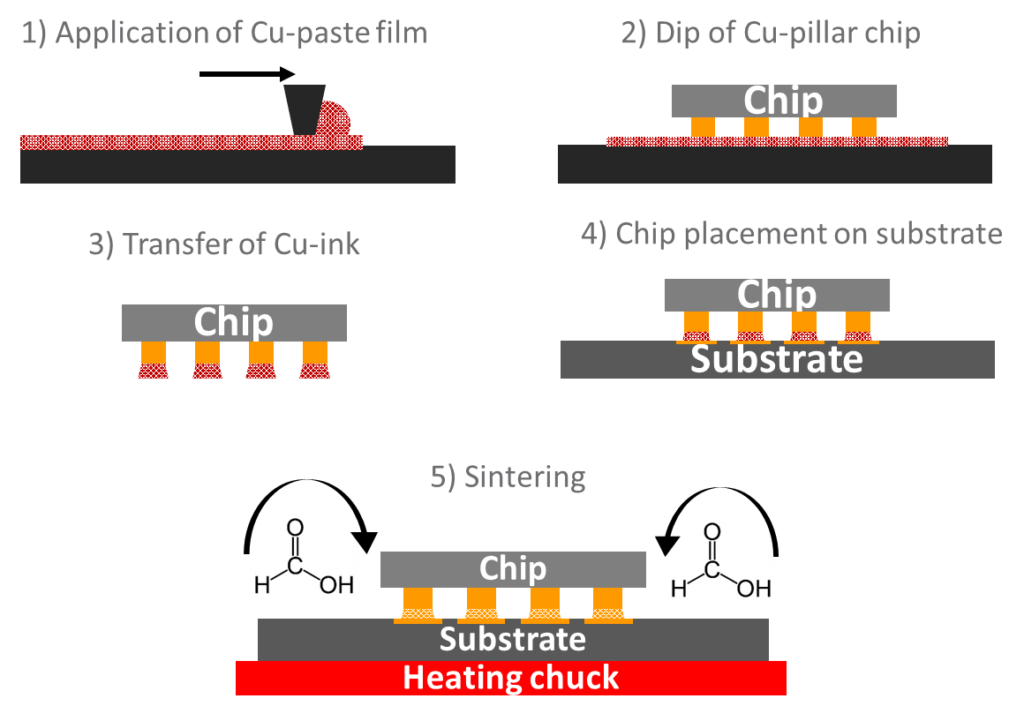 Rappresentazione schematica del processo di dipping. 1) L’inchiostro viene spalmato con uno spessore di circa 20 µm su una superficie liscia 2) i terminali elettrici del chip vengono parzialmente immersi nel film d’inchiostro 3) in seguito alla rimozione del chip dal film d’inchiostro, le nanoparticelle di rame ricoprono le punte dei terminali 4) il chip viene allineato e assemblato sul substarto desiderato 5) il contatto elettrico viene formato sinterizzando le nanoparticelle ad una temperatura massima di 200 °C utilizzando vapori di acido formico per ridurre l’ossido di rame