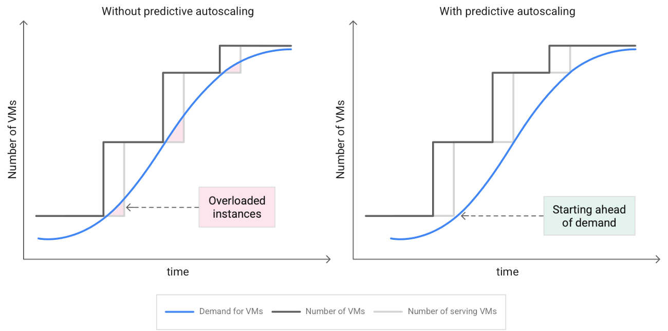 L’autoscaling predittivo utilizza le funzionalità di machine learning di Google Cloud per prevedere le esigenze di capacità. Esso crea le VM in anticipo rispetto alla domanda crescente, lasciando abbastanza tempo all’applicazione per inizializzarsi.