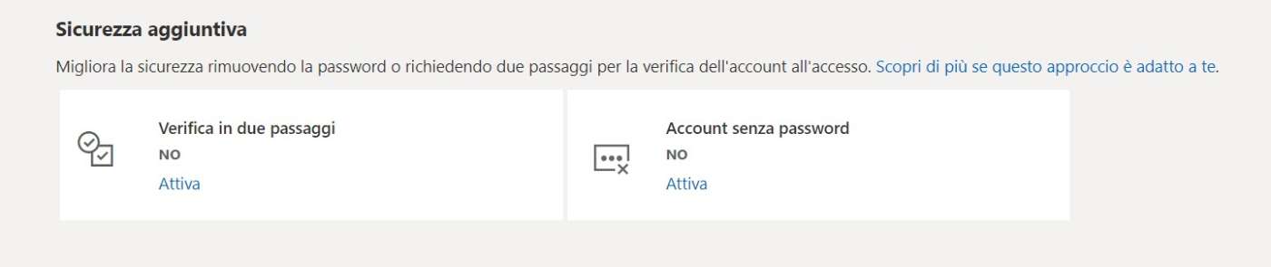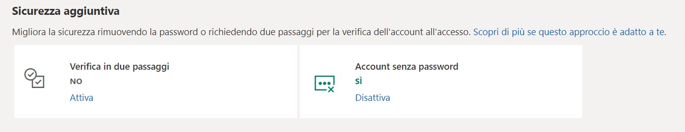 Nella schermata delle opzioni avanzate di sicurezza, nella sezione Sicurezza aggiuntiva, è presente l’opzione Account senza password.