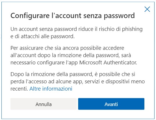 E se, tuttavia, dovessimo scoprire che l’accesso senza password non fa per noi? C’è sempre la possibilità di tornare all’utilizzo della password (una nuova). Tra l’altro, la stessa Microsoft avvisa che dopo la rimozione della password è possibile che si perda l’accesso ad alcune app, dispositivi e servizi meno recenti.