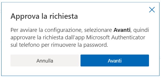 Microsoft visualizza una procedura guidata, il cui primo passaggio informa che è necessario configurare l’app Microsoft Authenticator prima di attivare l’accesso senza password.