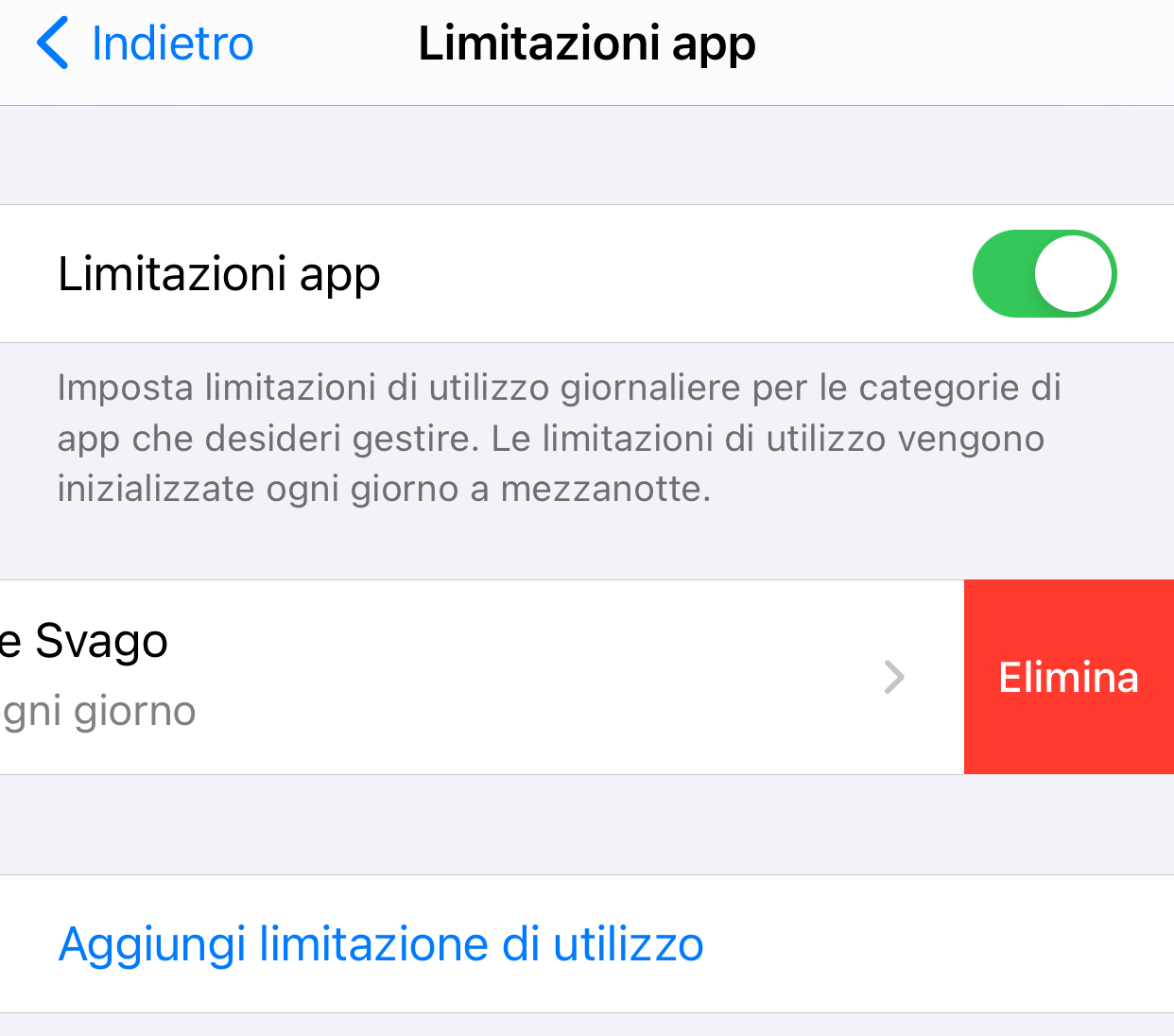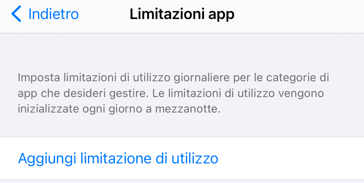 Se già hai impostato dei limiti di utilizzo temporali, li vedrai nella schermata successiva, che altrimenti propone solo il tasto Aggiungi limitazione di utilizzo: tocca sul tasto per creare una nuova limitazione.