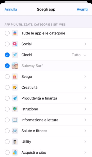 Nella schermata successiva, Scegli app, iOS mostra una lista di app, categorie e siti web tra quelli più utilizzati: per impostare il limite di utilizzo all’intera categoria, tocca sul controllo di selezione presente di fianco al nome, a sinistra. Oppure, per vedere le app presenti all’interno di una categoria ed eventualmente impostare un limite solo per un’app specifica, tocca sulla riga della categoria. Quando hai completato la selezione, tocca su Avanti.