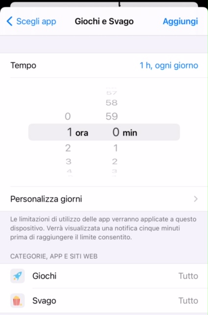 Nella schermata successiva imposta il limite di tempo giornaliero per le app o categorie selezionate: per farlo hai a disposizione il classico selettore di ore e minuti di iOS; puoi anche personalizzare il limite in base ai giorni della settimana. Quando hai completato la pianificazione, tocca su Aggiungi per attivare il limite di utilizzo.