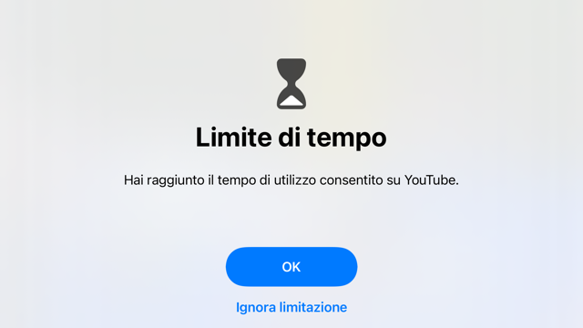 Cinque minuti prima di raggiungere il limite quotidiano di utilizzo, iOS visualizza una notifica sul display di iPhone. Quando il limite è raggiunto, una schermata occupa lo schermo, ma la limitazione può essere ignorata (se conosci il codice di sblocco di Tempo di utilizzo o se il codice non è stato nemmeno impostato, come dicevamo prima).