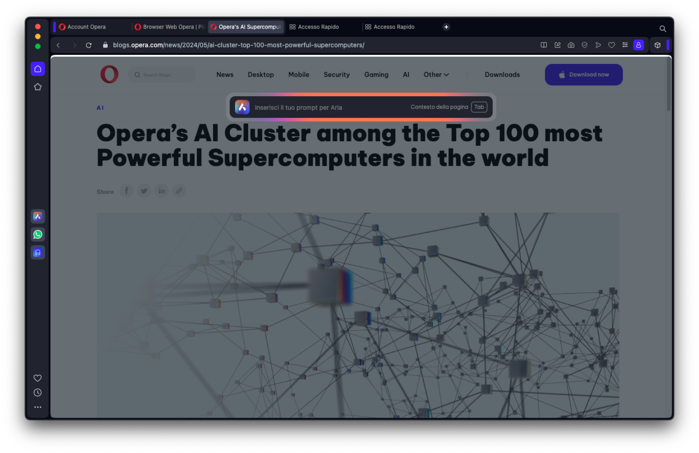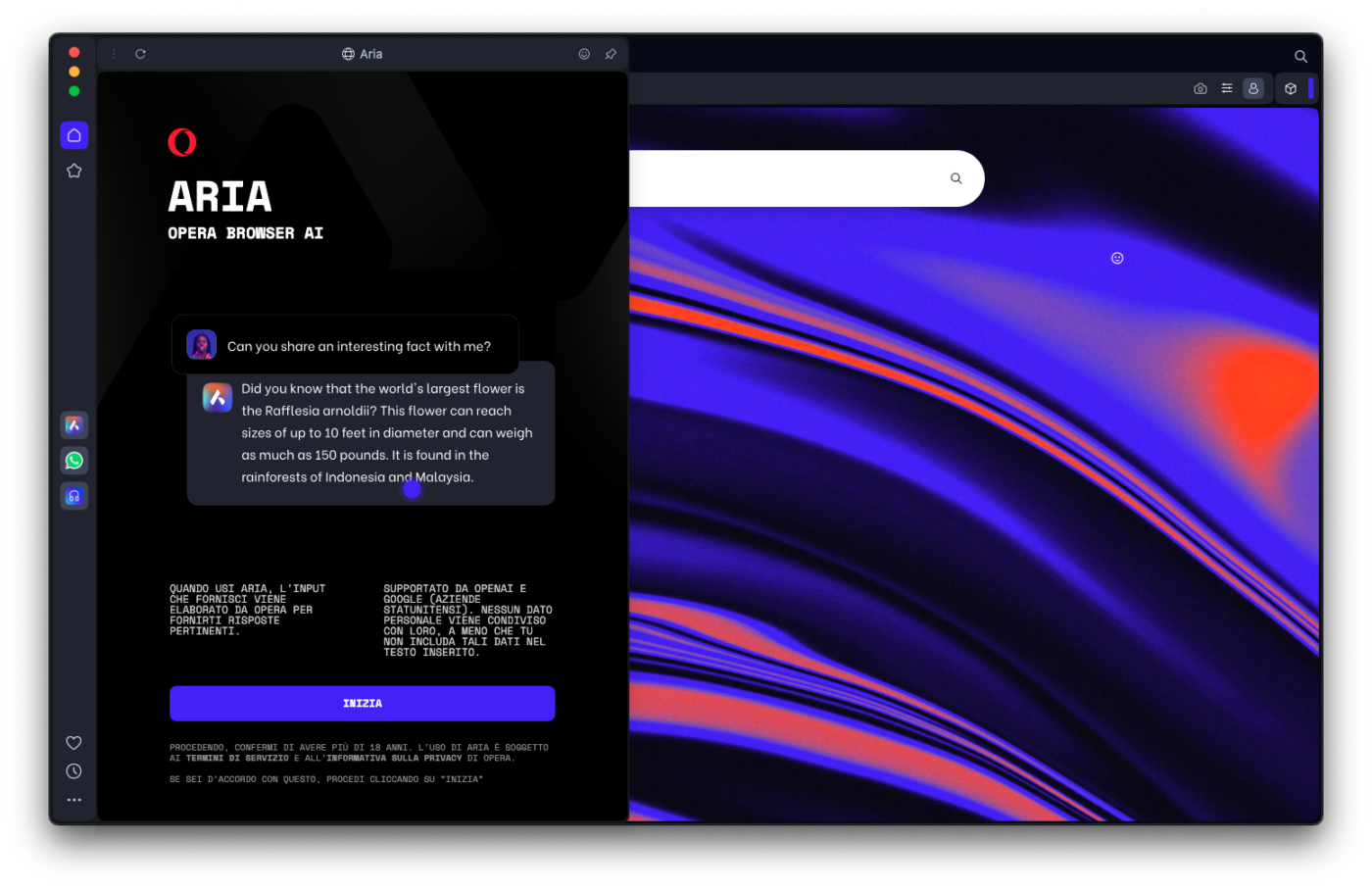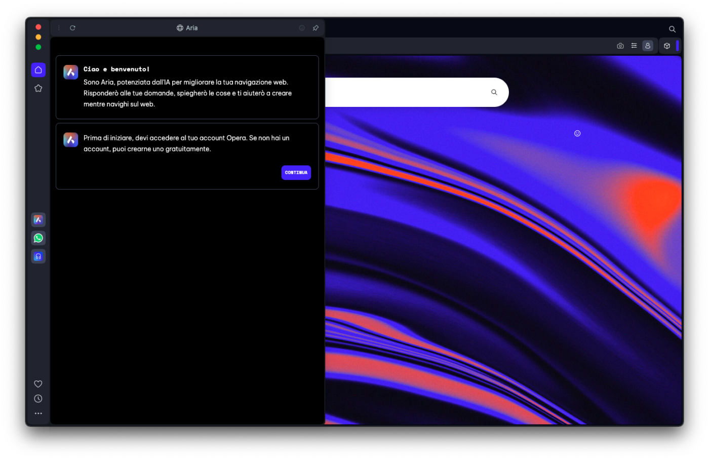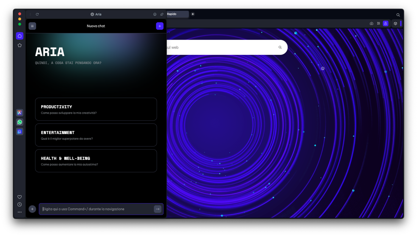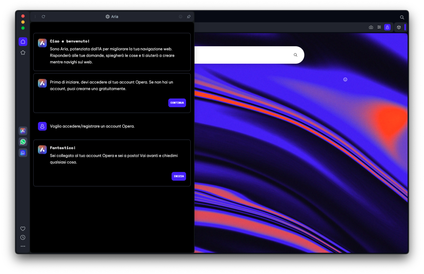 Il primo, è con un clic sull’icona di Aria nella barra laterale di Opera (oppure, se la scheda Aria è già aperta e abbiamo appena effettuato il login, con un semplice clic sul pulsante Inizia).