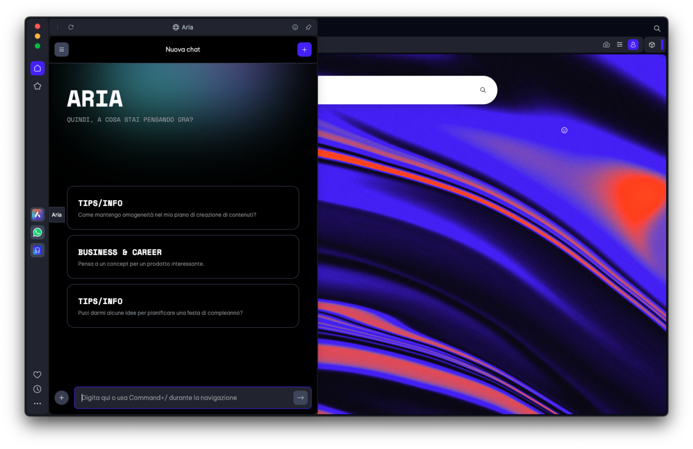 Il secondo modo per avviare una conversazione con Aria è mediante l’abbreviazione di tastiera cmd + / (sul Mac, come nel nostro esempio; su Windows è Ctrl + /). Questo shortcut apre la Command Bar per la linea di comando.